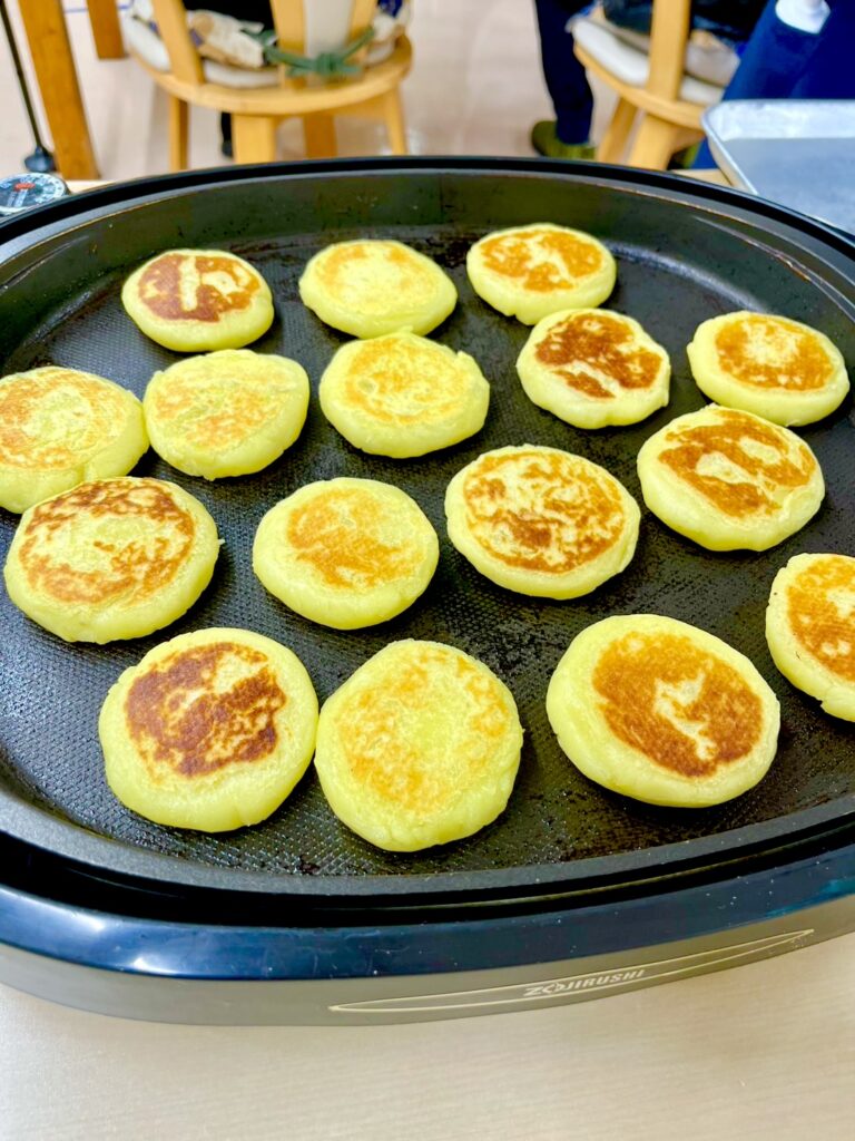 月に1回デイサービスにておやつレクを開催しています。今回はさつまいもをたっぷり使用した、いももちならぬ「さつまももち」を作りました!丸める作業や焼く作業などを皆さんで一緒に楽しく行い、焼きたてを召し上がっていただきました♪みたらしをかけて召し上がっていただき、さつまいものホクホク感とみたらしの甘じょっぱさがとても相性良く、おかわりをする方もたくさんいらっしゃいました!