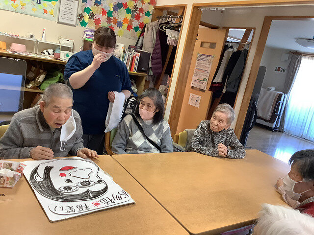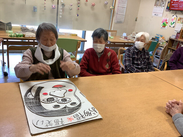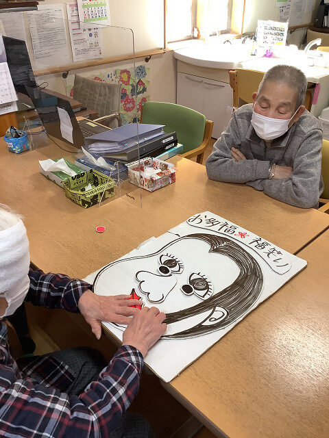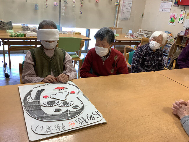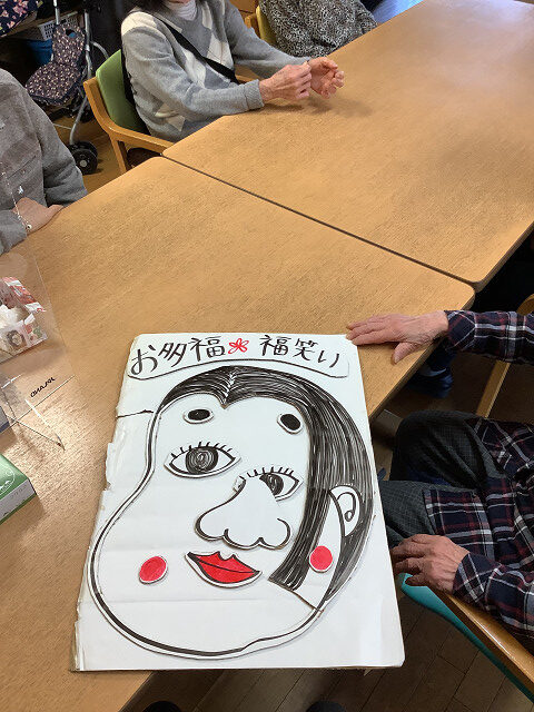 新春のレクリエーションで「福笑い」を皆さんで挑戦して頂きました。